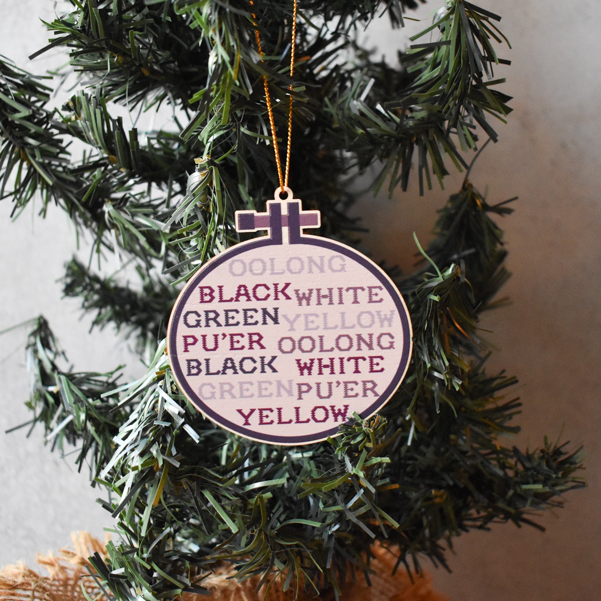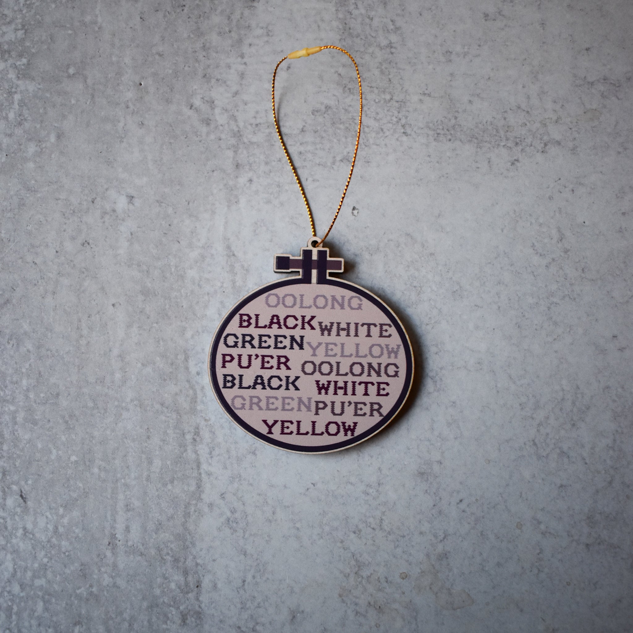 This 3-inch wood ornament features my tea cross-stitch design printed on sustainably sourced maple veneered MDF construction.